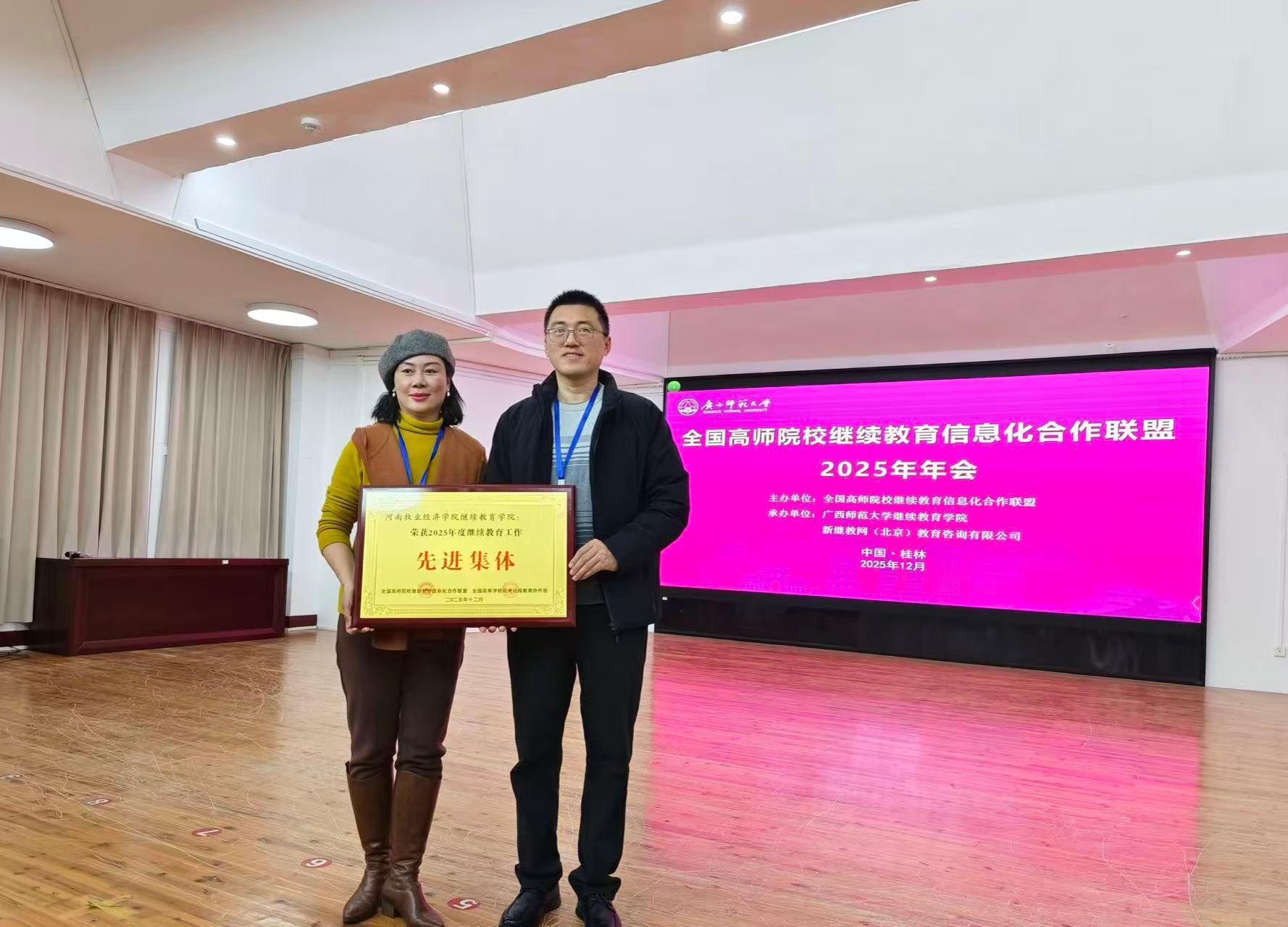 会上,教育部职业教育与成人教育司高等继续教育处副处长徐璐作指导报告。来自全国多所院校的继续教育负责人、专家学者齐聚一堂,围绕新时代继续教育的发展路径展开深入交流与研讨。 会议表彰了2025年度继续教育工作先进集体与个人。v站体育官网v站体育官网获评“2025年度继续教育工作先进集体”,吕琳副院长荣获“2025年度继续教育工作先进个人”称号。同时,v站体育官网校外教学点——南太行干部学院辉县市分院也荣获“2025年度继续教育工作先进集体”称号。