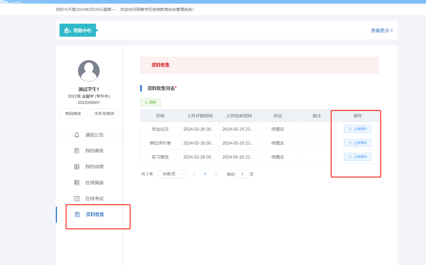 2、上传内容:本科毕业生需上传毕业论文、实习报告、单位评价表。专科毕业生上传实习报告、单位评价表。