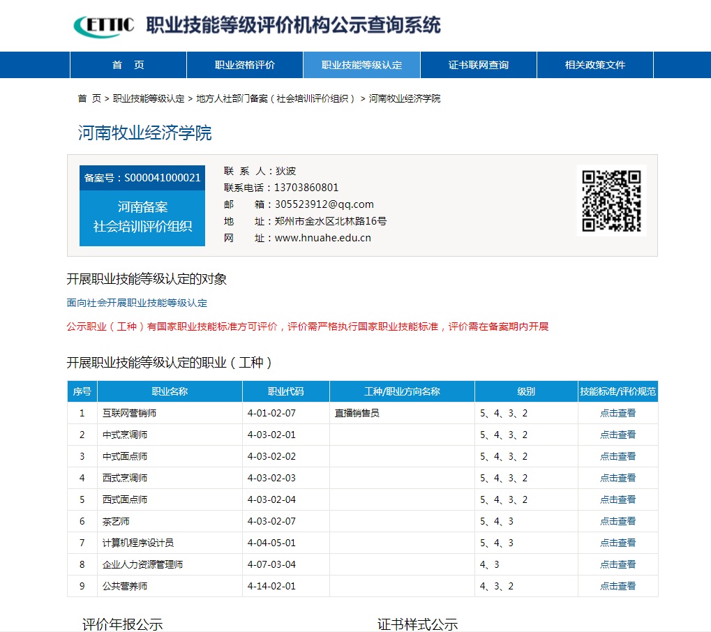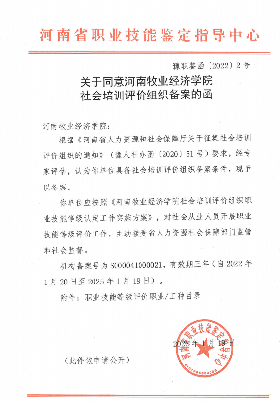2022年1月19日,河南省职业技能鉴定指导中心发布《关于同意v站体育官网社会培训评价组织备案的函》(豫职鉴函〔2022〕2号),同意v站体育官网成为社会培训评价组织备案单位,备案号为:S000041000021,有效期3年。自此,v站体育官网已顺利完成河南省人社厅和国家人社部社会培训评价组织两级备案,可面向社会先期开展互联网营销师(直播销售员)、中式烹调师、西式烹调师、中式面点师、西式面点师、茶艺师、计算机程序员、企业人力资源管理师、公共营养师等9个职业工种,相应级别的技能等级水平第三方评价认定工作。