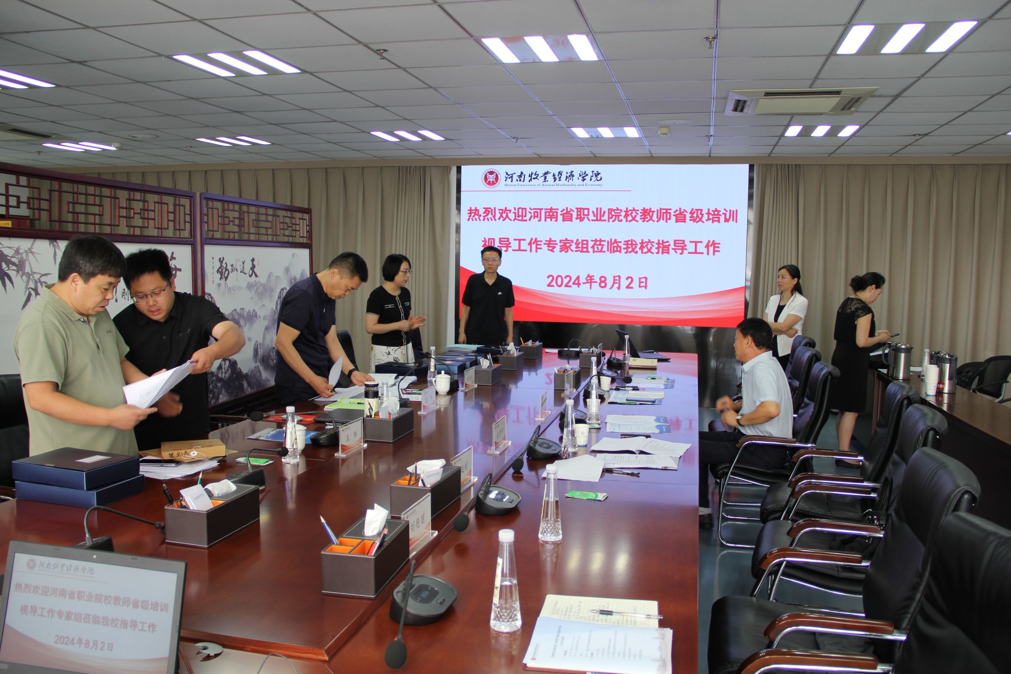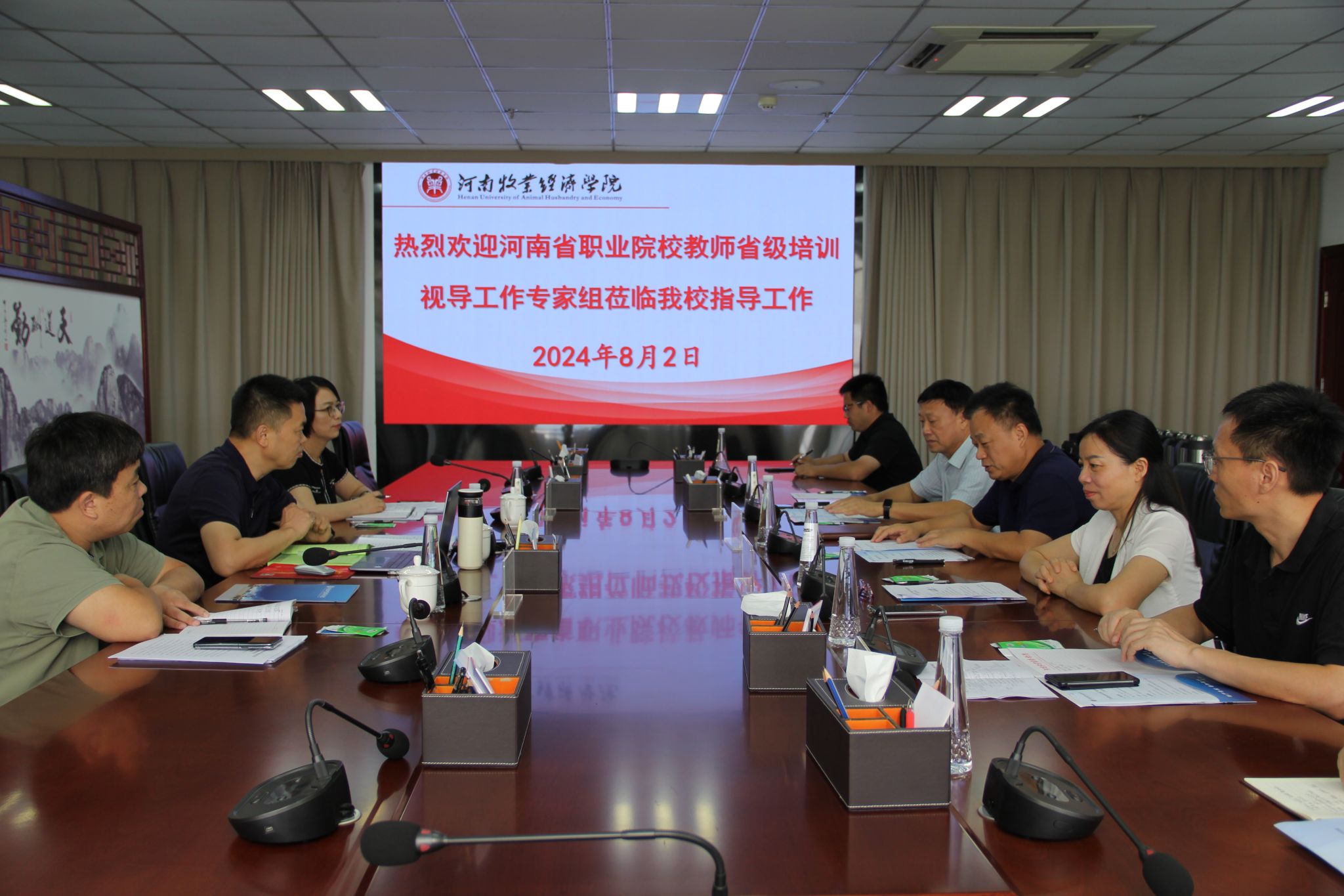 8月2日上午,河南省职业院校“双师型”教师省级培训专项视导组一行3人莅临v站体育官网双师培训基地进行视导。专家组由河南经贸职业学院教学副校长康坤、河南农业职业学院教务处长智丽红、郑州工业安全职业学院招生就业处副处长王伟组成。河南牧业经学院副校长席磊出席视导会并致辞,v站体育官网党总支书记张君华、院长宋平、副院长周延州及培训管理人员参加会议。会议在龙子湖校区图书馆841举行,v站体育官网党总支书记张君华主持汇报会。